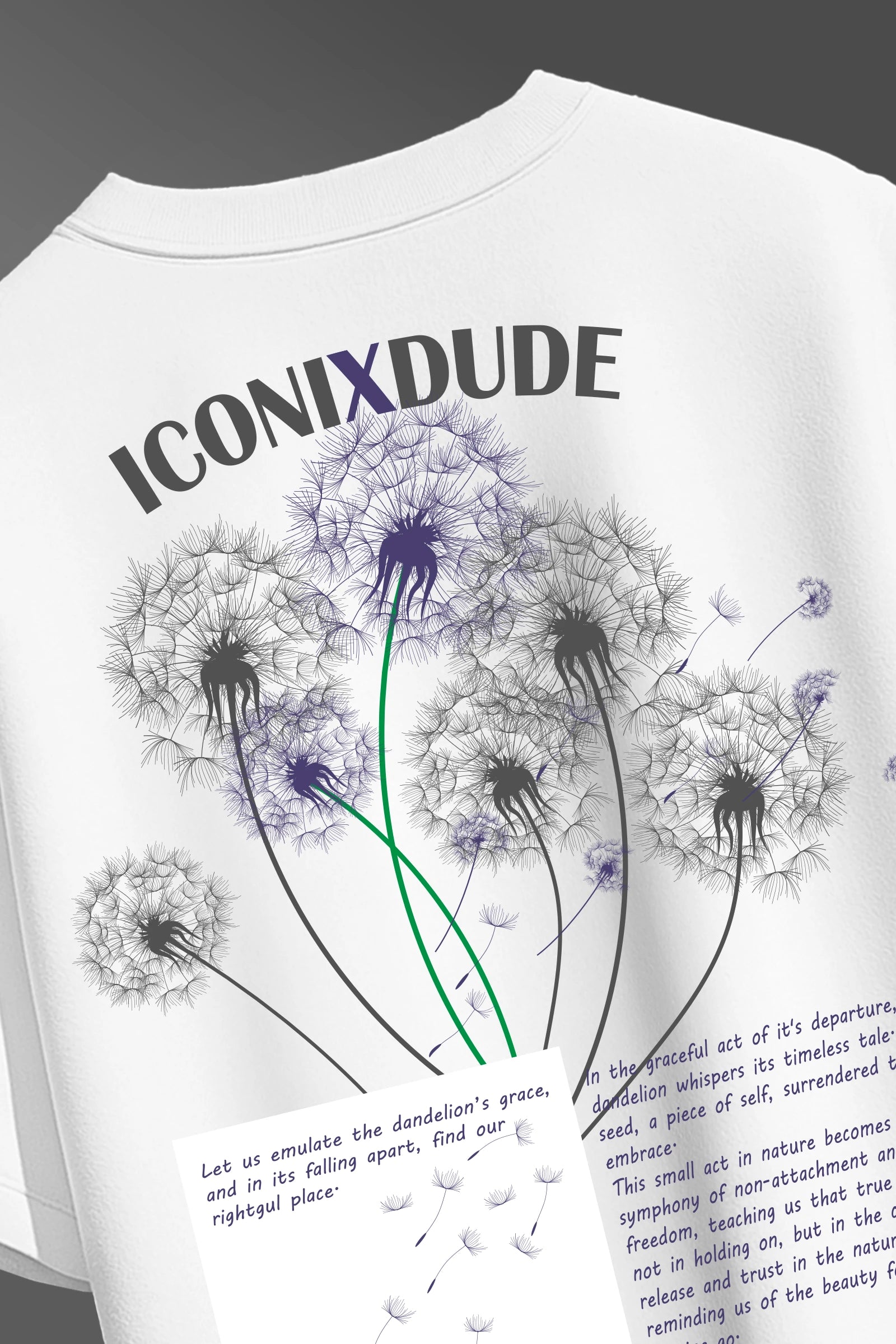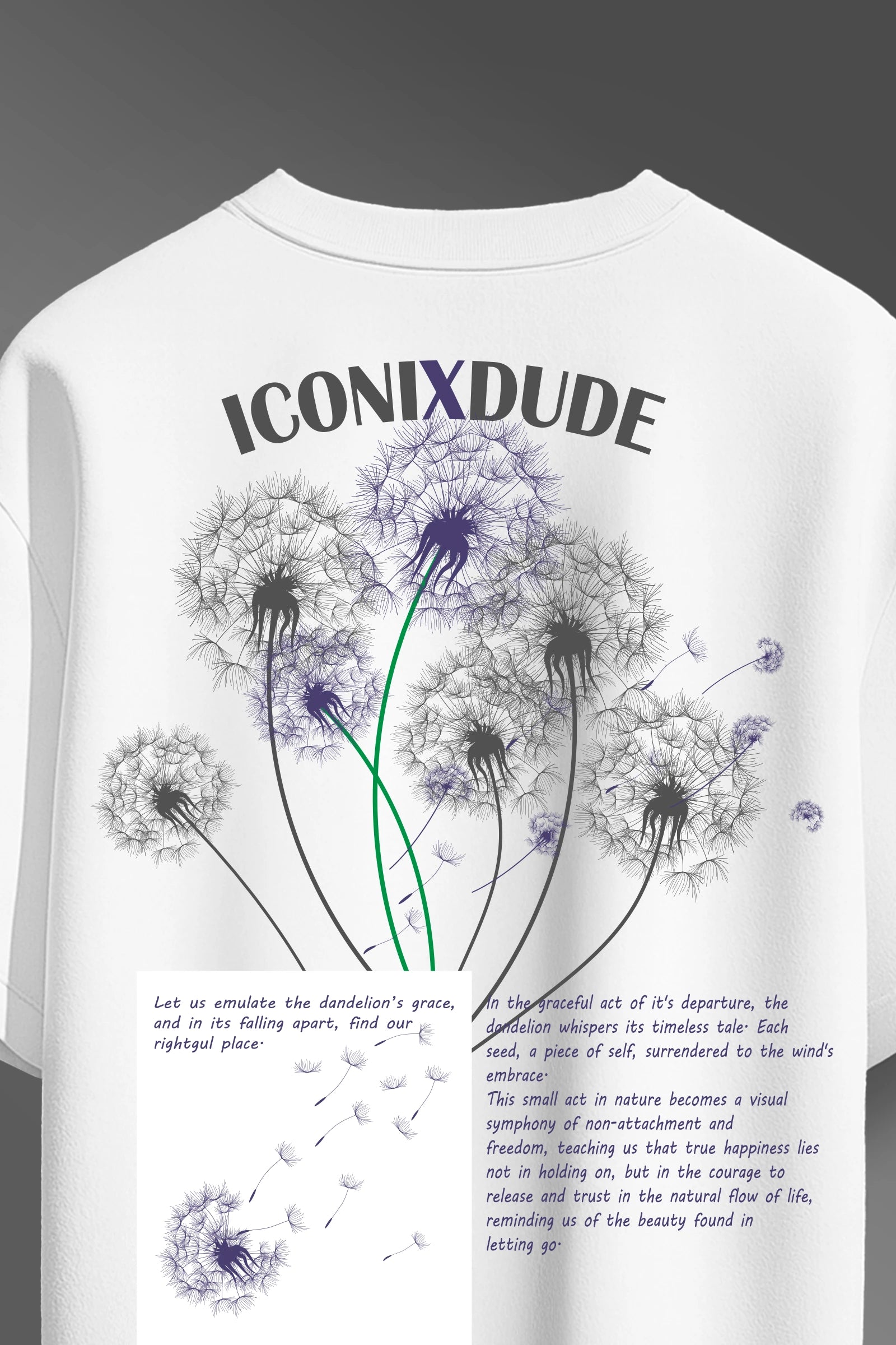 The back showcases a detailed ICONIXDUDE graphic — a poetic blend of nature and philosophy, reflecting the beauty of letting go and embracing change. The front carries a subtle complementary design, keeping the look balanced and versatile.